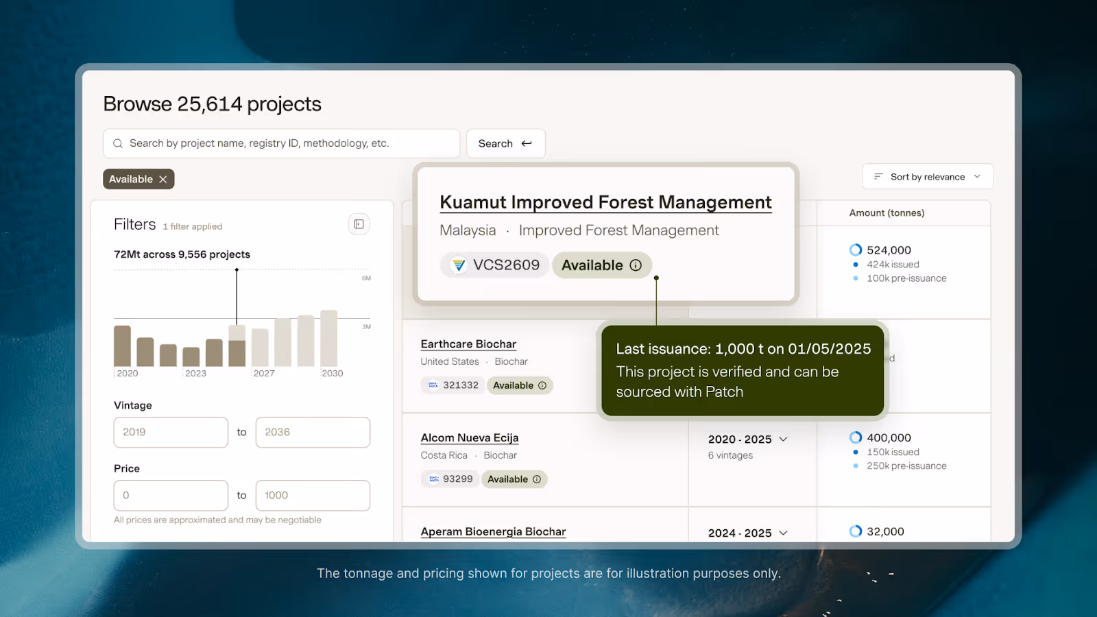 And because procurement depends on sourceability, the platform surfaces issuance activity and listings, including projects preliminarily listed but not yet validated. That gives buyers early signals on what’s moving from pipeline to reality.