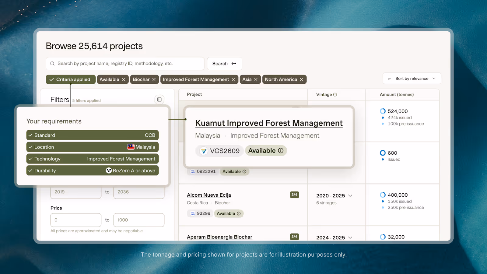 - Full visibility into the voluntary carbon market so they can streamline procurement and consolidate vendors
